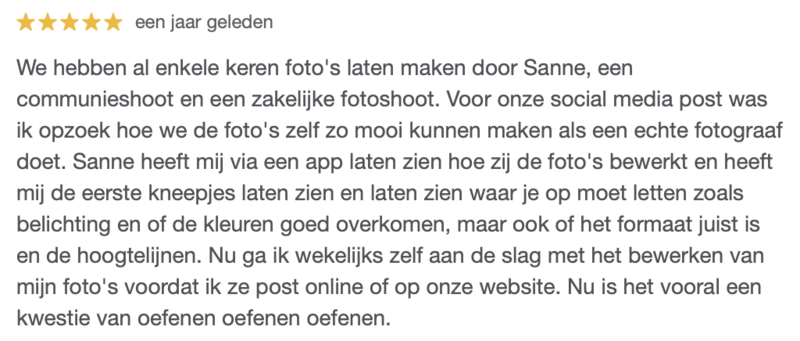 Tijd om het geleerde toe te passen. Twee weken lang kun je mij via WhatsApp praktische vragen stellen of om feedback vragen op je foto’s. Er is ook een uitbreiding mogelijk op de workshop.